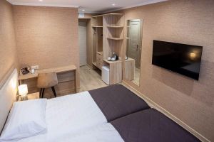Небольшой по площади номер, состоит из прихожей, спальни, санузел с душевой кабиной. Площадь номера - 16 кв.м. Балконы имеются только в номерах на 2-ом этаже. За счет этого номера меньше по площади, чем на других этажах. Вид из номеров на монастырь, территорию, дорогу и лес. Возможно дополнительное место в виде евро-раскладушки(кроме 2 этажа).