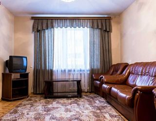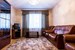 Коридор, гостиная с диваном, кухня с холодильником, спальня, ванная комната с ванной и WC.
