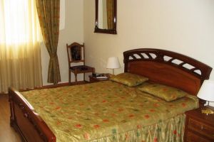 - В спальне: 2-спальная кровать, либо две полутороспальные кровати, прикроватные тумбочки, платяной шкаф, зеркало, светильники, ковры;