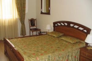 - в спальне имеется 2-спальная кровать, платяной шкаф, зеркало, прикроватные тумбочки, ковры;