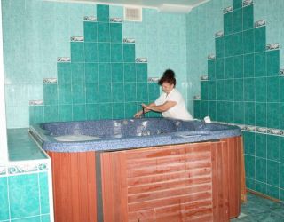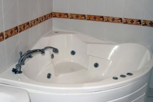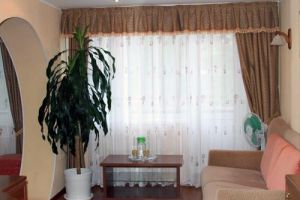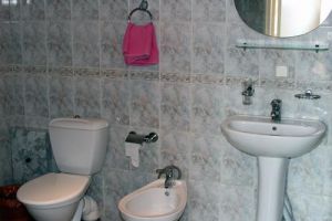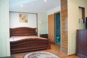 Оснащение номера: телевизор, холодильник, электрочайник, совмещённый санузел (угловая гидромассажная ванна, биде, унитаз, раковина).