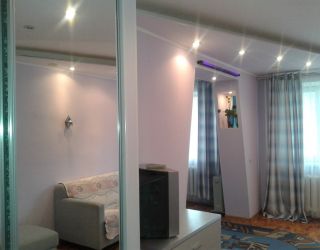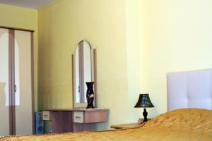 В спальной комнате — одна двуспальная кровать с прикроватными тумбочками и светильниками, в гостиной комнате — раскладной диван на 2 дополнительных места.
