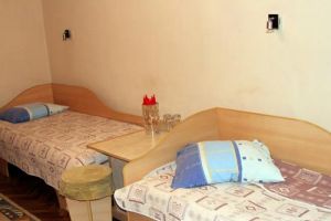 В каждом номере – по две полутороспальных кровати с прикроватными тумбочками и светильниками.