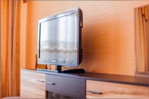 Холодильник, телевизор, картина, телефон, часы, тумба под телевизор, тумба прикроватная, стол туалетный с зеркалом, 2 стула мягких, стол-сушилка для белья, 2 кровати, шкаф-купе с зеркалом, душ, графин, два стакана, блюдо круглое, комплект полотенец (3 шт.) - 2 комплекта, простынь.