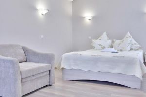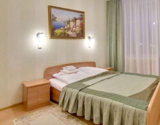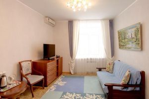 В номере: кровать, диван, стенка ТВ, стол журнальный, тумбочка прикроватная, телевизор, холодильник, кондиционер, набор посуды на две персоны, фен, чайник электрический.