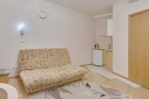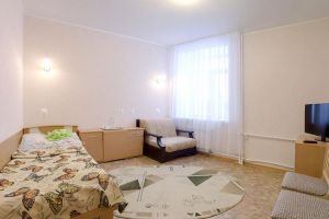 В номере: кровать 1,5 спальная, диван, шкаф, зеркало, стол, стул, телевизор, холодильник