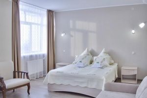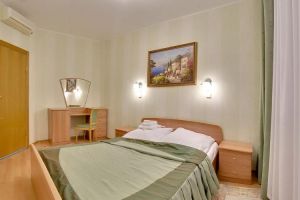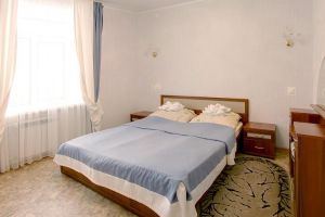 В номере: кровать 2-х спальная, диван, комод, стол журнальный, тумба прикроватная, телевизор, холодильник, кондиционер, телефон, сейф, фен, набор посуды на две персоны.