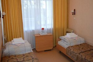 В номере: 2 кровати, прикроватные тумбочки, стол, шкаф с зеркалом, 2 стула, телевизор.