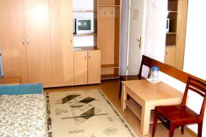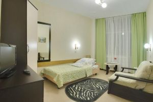 В номере: кровать, шкаф, тумба под холодильник, зеркало, стол, кресло-кровать, 2 стула, телевизор, холодильник.