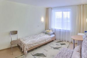 В номере: 2 кровати, шкаф-купе, тумба двойная, зеркало, 2 стула, тумба под холодильник, телевизор, холодильник