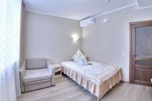 В номере: кровать, прикроватная тумбочка, шкаф, журнальный стол, зеркало, кресло-кровать, стул, телевизор, холодильник, кондиционер