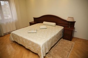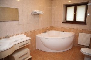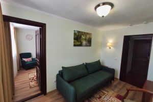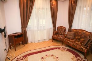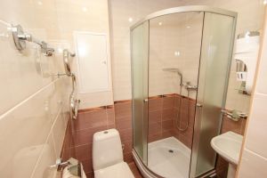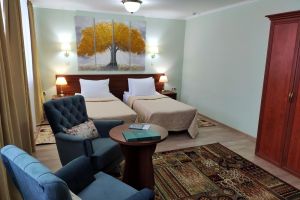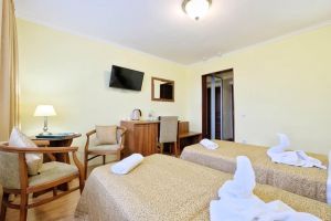Двухкомнатный номер со всеми удобствами с балконом (холодильник, телевизор, гидрокабина, совмещенная с санузлом, 2 кровати раздельные (возможно соединить - общий матрац – при желании гостя), 2 тумбочки, журнальный столик, 2 кресла, шкаф для одежды и обуви, посуда: графин, 2 стакана, чайная пара; электрочайник, средства личной гигиены на каждого гостя: одноразовые – гель для душа, шампунь, шапочка для душа, тапочки, 2 халата махровых, фен, половое покрытие – ламинат, натуральный ковер).