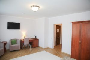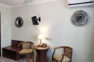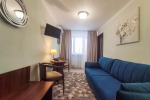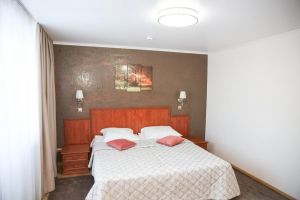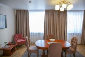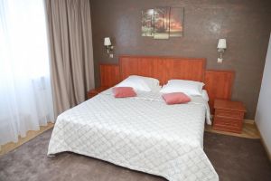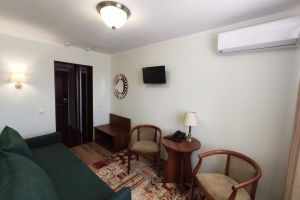 Номер состоит из уютной спальни с двухспальной кроватью, гостиной, прихожей, ванной комнаты, совмещенной с санузлом, с выходом на балкон (в летнее время — оснащен стульями для отдыха).