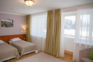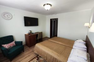 Номер состоит из уютной спальни с двумя полутораспальными кроватями (по желанию гостя — есть возможность соединить кровати, с общим матрацом); прихожей; ванной комнаты, совмещенной с санузлом; с выходом на балкон (в летнее время — оснащен стульями для отдыха).