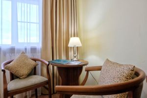 Комфортабельная мебель, строгий дизайн, мягкая, теплая цветовая гамма отделки, утонченные штрихи оформления интерьера подчеркивают его солидный статус. Здесь гости санатория смогут наслаждаться отдыхом после процедур в атмосфере уюта и покоя.