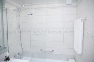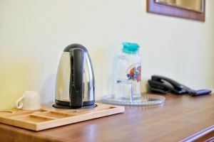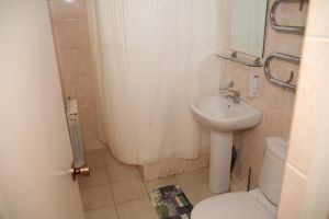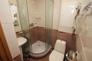 Однокомнатный номер со всеми удобствами с балконом (холодильник, телевизор, гидрокабина, совмещенная с санузлом, 2 кровати раздельные (возможно соединить - общий матрац – при желании гостя), 2 тумбочки, журнальный столик, 2 кресла, шкаф для одежды и обуви, посуда: графин, 2 стакана, чайная пара; электрочайник, средства личной гигиены на каждого гостя: одноразовые – гель для душа, шампунь, шапочка для душа, тапочки, 2 халата махровых, фен, половое покрытие – ламинат, натуральный ковер).