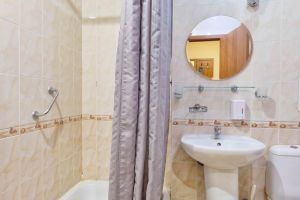 Санузел: душ, умывальник, унитаз, зеркало, комплект полотенец, фен.