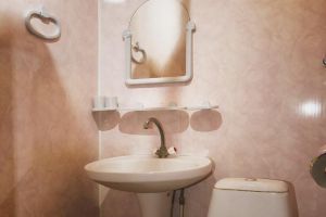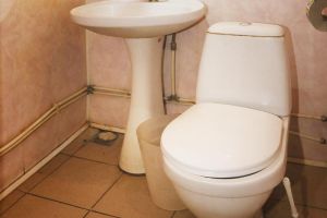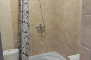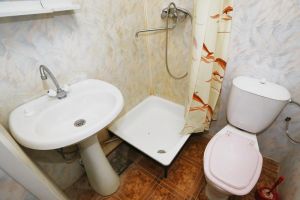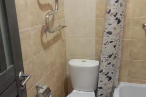- санузел с душем, раковиной, унитазом и полотенцесушителем
