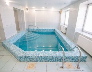 Два бассейна – большой бассейн с подсветкой площадью 300 м2 (два подводных гейзера, подводный массаж), горки и детский бассейн глубиной 0,9 м.