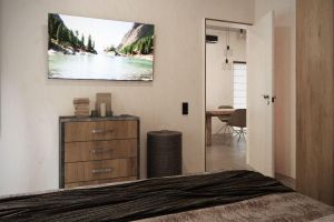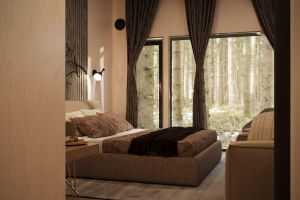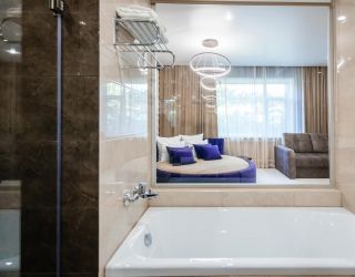 Просторный современный номер премиум класса с панорамными окнами. В номере есть собственная кухня, что очень удобно, особенно для поездок с семьей. Кровать кинг сайз, душевая кабина, ванна, электрокамин - здесь есть всё для комфортного отдыха и наслаждения отпуском.