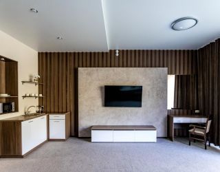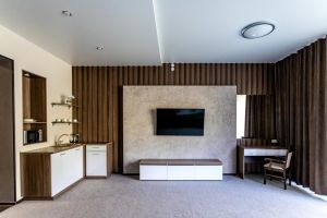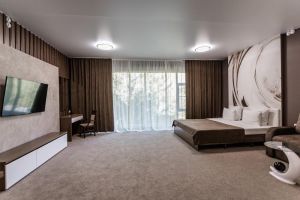 Просторный современный номер премиум класса с панорамными окнами. В номере есть собственная кухня, что очень удобно, особенно для поездок с семьей.