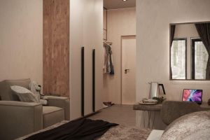 Современный однокомнатный номер повышенного комфорта с двуспальной кроватью Подойдет для размещения 1-2 гостей. Расположен над Переходной галереей Главного корпуса. Просторный номер с двухспальной кроватью.