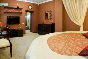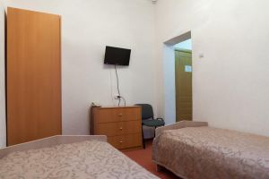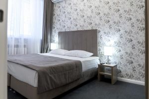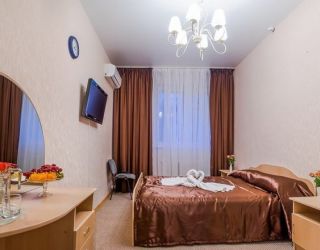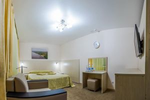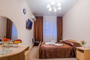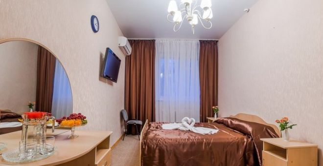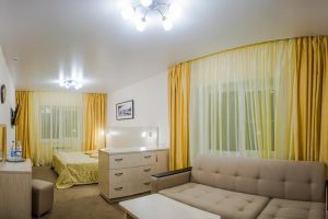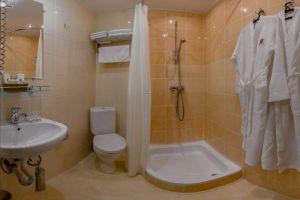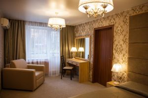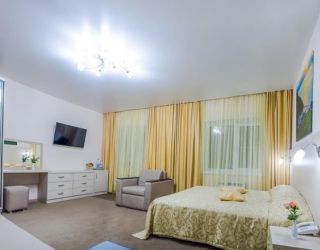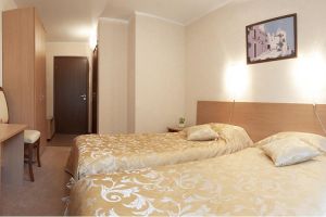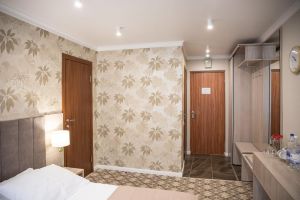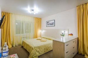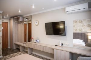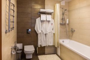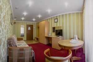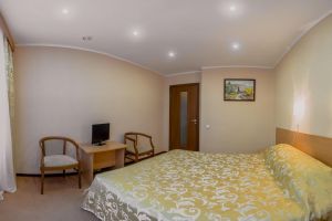 В комнате: двуспальная либо две 1,5-спальные кровати, шкаф для одежды, кондиционер, телевизор, холодильник, телефон, сейф. В ванной комнате: фен, полотенца, индивидуальные парфюмерные наборы. Гостям предоставляются халаты и тапочки.