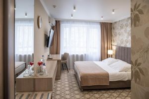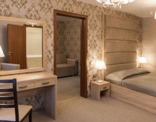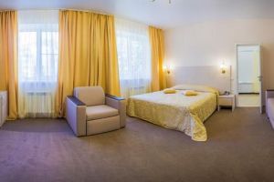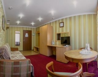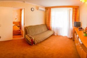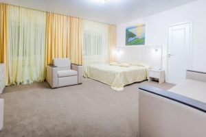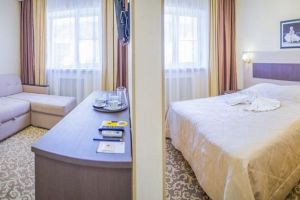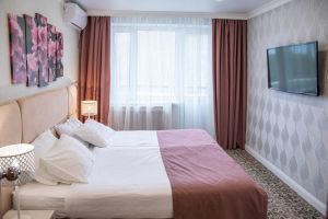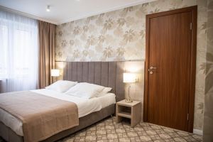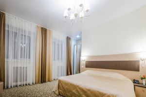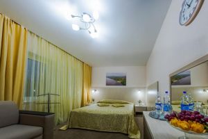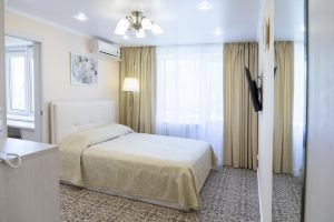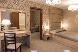 Характеристики: 28 кв.м., однокомнатный, в комнате разделены зоны спальни и гостиной. В номере: кондиционер, холодильник, телефон, сейф, ЖК телевизор, мини-бар с прохладительными напитками, чайник (чай, кофе). В ванной комнате: ванна с гидромассажем, теплый пол, фен, халаты, полотенца, дозаторы с мылом и шампунем.