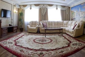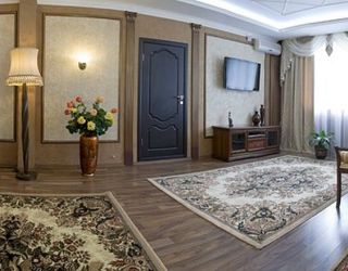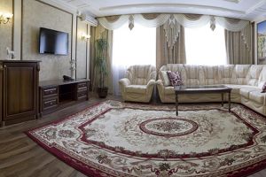 В гостиной (30 кв.м.) разделены диванная и столовая зоны. ЖК телевизор, кондиционер, холодильник, телефон, сейф, мини-бар с прохладительными напитками, чайник (чай, кофе). В спальне (40 кв.м.) большая кровать, зона отдыха с двумя креслами, ЖК телевизор, кондиционер. В ванной комнате: теплый пол, душевая, джакузи, фен, халаты, полотенца, индивидуальные парфюмерные наборы.