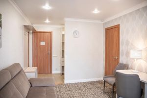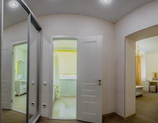 В спальне: двуспальная кровать, телевизор. В гостиной: диван, шкаф для одежды, кондиционер, холодильник, телевизор, телефон, сейф. В ванной комнате: полотенца, индивидуальные парфюмерные наборы. Гостям предоставляются халаты и тапочки.