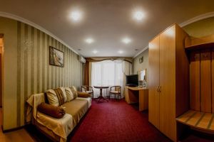 В номере: двуспальная кровать (трансформер), диван, плазменный телевизор, шкаф для одежды, кондиционер, холодильник, телефон, сейф. В ванной комнате (5,2 кв.м.): ванная, фен, полотенца, индивидуальные парфюмерные наборы. Гостям предоставляются халаты и тапочки.