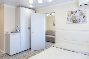 В гостиной зона отдыха и гардероб: диван, ЖК телевизор (смарт ТВ), кондиционер, холодильник, телефон, сейф, мини-бар с прохладительными напитками, чайник (чай, кофе).В спальне двуспальная кровать, зона отдыха с одним креслом и туалетным столиком, ЖК телевизор (смарт ТВ), кондиционер. В ванной комнате теплый пол, ванная, фен, халаты, полотенца, индивидуальные парфюмерные наборы.