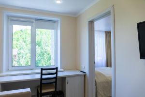 В номере: двуспальная кровать (трансформер), плазменный телевизор, шкаф для одежды, кондиционер, холодильник, телефон, сейф. В ванной комнате (5,2 кв.м.): ванная, фен, полотенца, индивидуальные парфюмерные наборы. Гостям предоставляются халаты и тапочки.