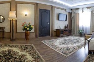 Однокомнатный, в комнате разделены зоны спальни и гостиной. В номере: кондиционер, холодильник, телефон, сейф, ЖК телевизор, мини-бар с прохладительными напитками, чайник (чай, кофе). В ванной комнате: ванна с гидромассажем, теплый пол, фен, халаты, полотенца, дозаторы с мылом и шампунем.