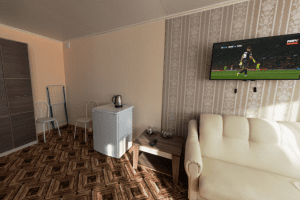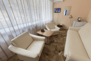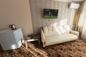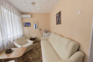 - 2-спальная кровать, диван, кондиционер, телевизор, мини-холодильник, душевая кабина, туалет, фен