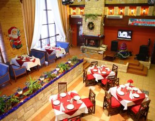 К зданию гостиницы Горнолыжного комплекса примыкает трехэтажное здание общественного питания, связанное с гостиницей теплым переходом на уровне второго этажа. Первый этаж включает в себя два обеденных зала: шашлычная на 36 посадочных мест, спорт-кафе – 72 посадочных мест.