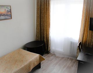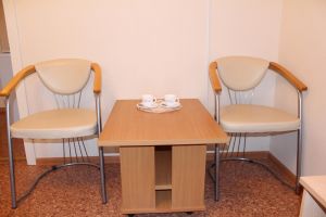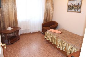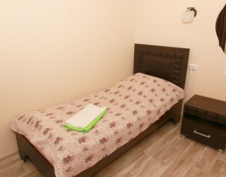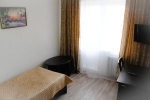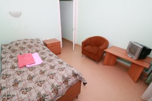 - односпальная кровать, кресло, журнальный стол, тумбочка, телевизор, посуда, общие на две комнаты: душевая и туалетная комната, встроенный шкаф для одежды, холодильник, чайник.