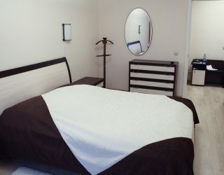 - односпальная кровать, кресло, журнальный стол, тумбочка, телевизор, посуда, общие на две комнаты: душевая и туалетная комната, встроенный шкаф для одежды, холодильник, чайник, фен, гладильная доска, утюг.