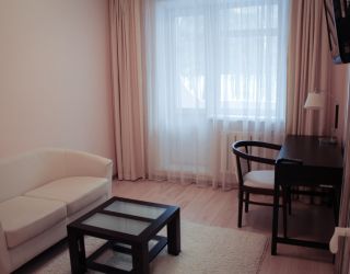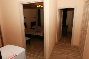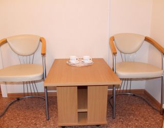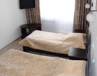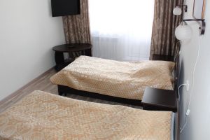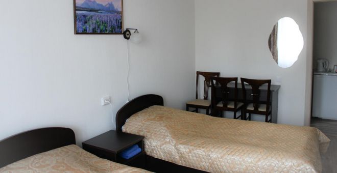 - две односпальные кровати, 2 тумбочки, 2 кресла, журнальный столик, телевизор, посуда, общие на две комнаты: душевая и туалетная комната, встроенный шкаф для одежды, холодильник, чайник.