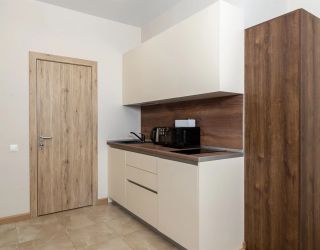 - Кровати, софа, кухонное оборудование: холодильник, электроплита, микроволновка, набор посуды и столовых приборов.