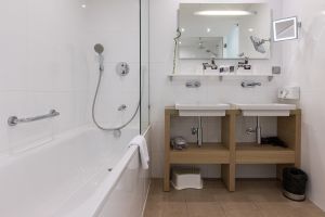 - Две односпальные кровати, индивидуальный температурный контроль, Wi-Fi, 32" LED экран, спутниковое ТВ, ванна, фен, эксклюзивные банные принадлежности, тапочки, халат, капсульная кофемашина, мини-бар