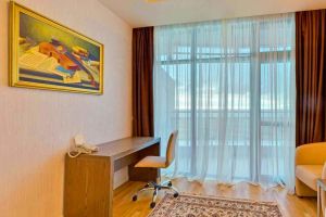 Имеется просторный балкон с ротанговой мебелью и прекрасным видом на дендрологический парк, а также ванная комната.
