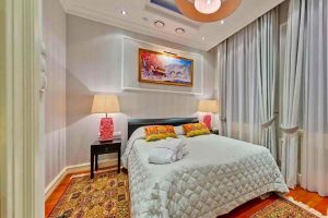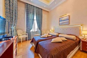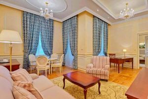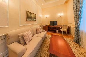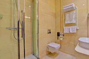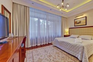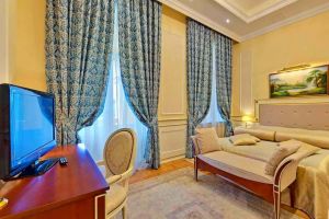 В номере расположена спальня, разделенная на зоны (зона сна – роскошная двухместная французская кровать, гостиная), и ванная комната с душевой кабиной.