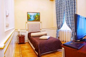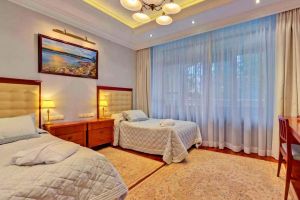В номере расположены две односпальные кровати, которые при желании можно соединить в одну большую. Имеется возможность размещения на дополнительном месте (раскладывающийся диван).