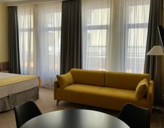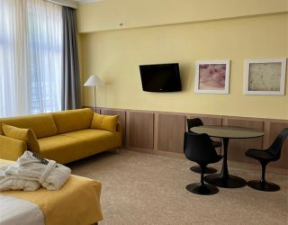 - 2-спальная или две 1-спальные кровати, раскладной диван,ТВ, рабочее место, сейф, чайный набор, кофемашина, ванна