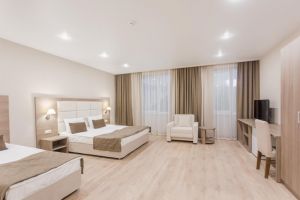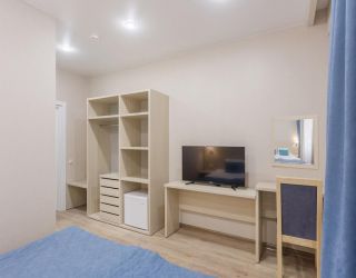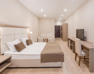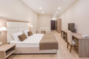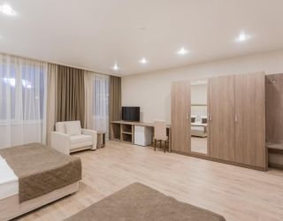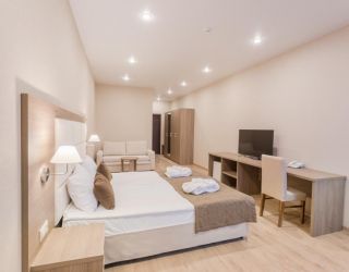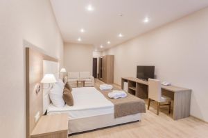 - Просторный однокомнатный номер с большой двуспальной кроватью и раскладным диваном.
