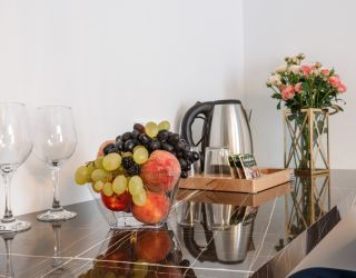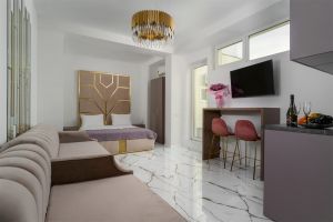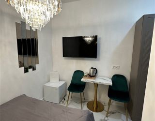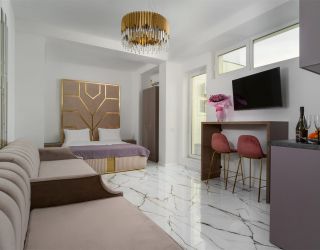 - Семейный номер — Самый востребованный номер, который не хочется покидать! Семейные номера повышенной комфортности идеально подходящие для большого количества гостей. Номер рассчитан на 4-5 мест, оснащён кухонной зоной, базовым набором посуды, а также имеет собственную террасу с видом на город.