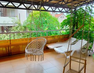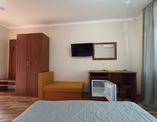 - Двуспальная и раскладная кровати, телевизор с плоским экраном, сплитсистема, собственная ванная комната, холодильник, фен.