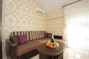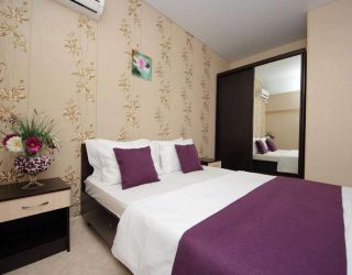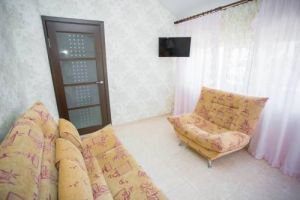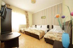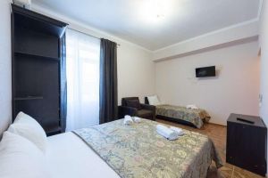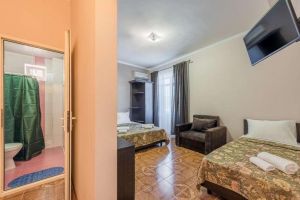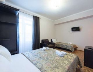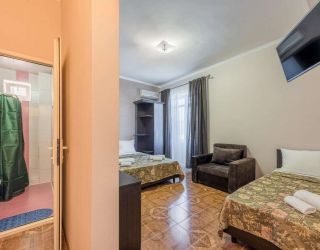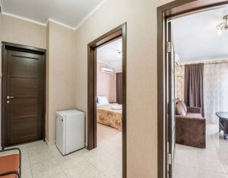 в номере: ( две комнаты, душ туалет, кондиционер, холодильник, телевизор, балкон, шкаф, прикроватные тумбочки, столик, односпальная кровать,двуспальная кровать, диваны раскладные wi-fi, (возможно доп место)(всего 3 номера) в стоимость входит завтрак