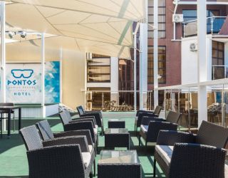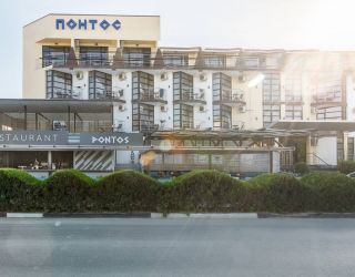 Трехзвездочный «Понтос» располагается в центре курортного поселка Витязево в 15 км от Анапы, в 8 км от аэропорта и в 8 км от ж/д вокзала и в 500 м от пляжа. За несколько минут ходьбы можно добраться до прогулочного променада "Паралия", на котором находится вся развлекательная и торговая поселкова инфраструктура: аквапарк, дельфинарий, кафе, рестораны, рынок, магазины, аптеки. До Анапы легко добраться любым видом транспорта по Пионерскому проспекту за 10-15 минут. На обширной охраняемой территории находятся два 4-этажных жилых корпуса. Быстрый доступ к номерам обеспечит современный лифт. Номерной фонд насчитывает 111 стильных номеров категорий стандарт, студия и люкс. Все номера оборудованы: удобной современной мебелью, ЖК телевизорами, телефоном, системой кондиционирования воздуха, холодильником, сейфом, туалетной комнатой с душевой кабиной, панорамными витражными тонированными окнами с выходом на меблированный балкон. Между корпусами расположены три бассейна (с подогревом), детская площадка и кафе. На территории также есть тренажерный зал, ресторан. Гости отеля могут сходить в сауну, поиграть в бильярд или настольный теннис, съездить на одну из многочисленных экскурсий по побережью. А в подвале отеля имеется отличный пивной бар. Для малышей оборудована детская игровая комната, детская площадка, детский подогреваемый бассейн, работают аниматоры. У отеля есть гостевая бесплатная парковка и конференц-зал, рассчитанный на 100 посадочных мест. На всей территории отеля действует бесплатный wi-fi.